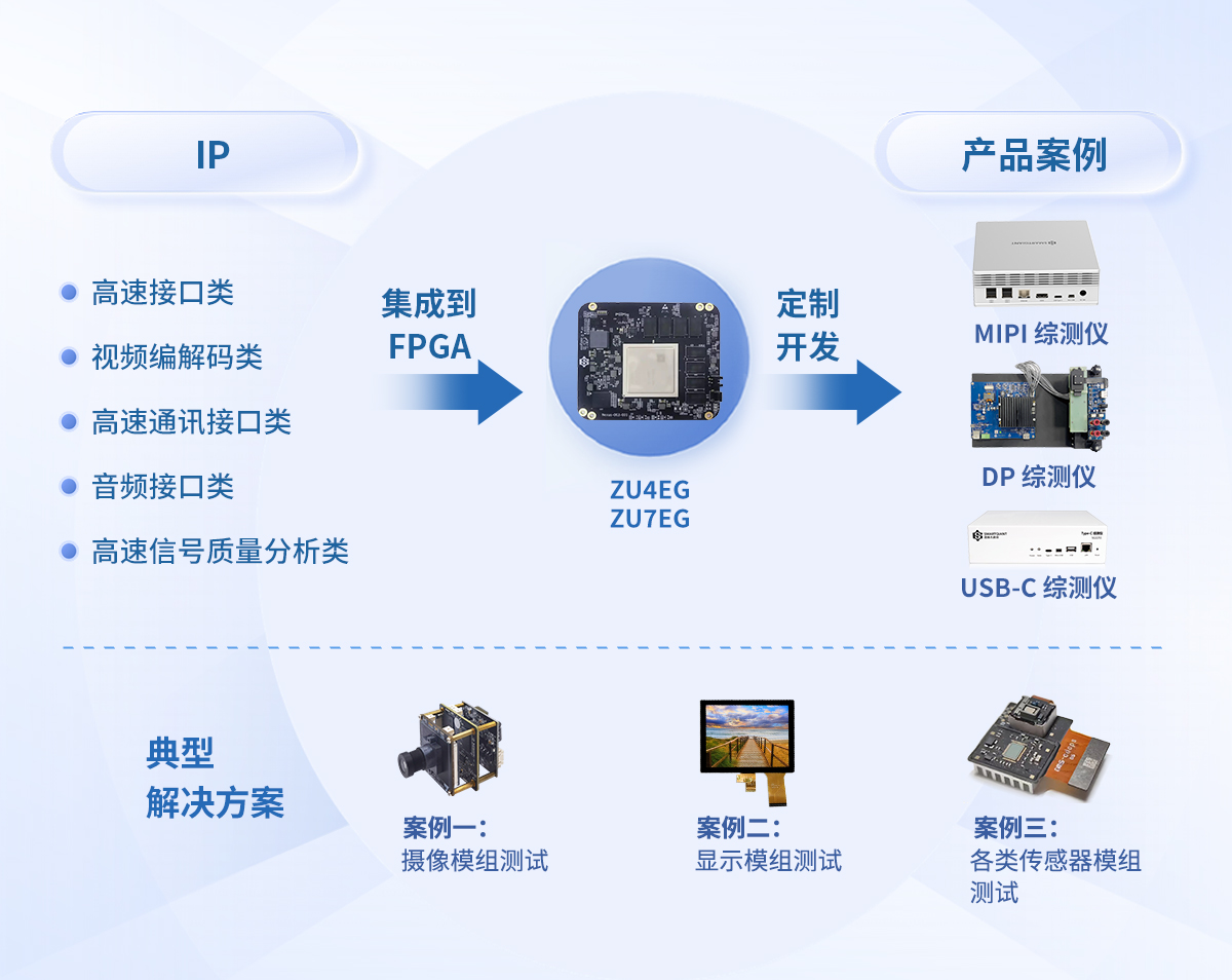 基于自主研发的 FPGA 核心板与 IP,打造了 MIPI 综测仪、高速总线测试平台、MIPI RFFE 控制器、USB-C 综测仪 等产品,具备从硬件定制化设计到量产交付的全链路能力。支持 FPGA 硬件重构与 IP 深度定制,原型验证、功能优化与大规模生产可并行推进,实现从设计、验证到批量部署的全流程覆盖。